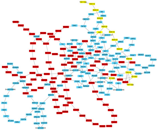 Comparing the fluxes of the IRs in the two times of simulations, there were 489 IRs with flux variations. To avoid false positive results due to calculation errors, only the reactions with flux changes larger than 0.01 mmolgDW−1h−1 or smaller than −0.01 mmolgDW−1h−1 remained. Finally, 236 IRs were obtained after screening, including 27 P-R IRs, 116 P-P IRs, 81 R-R IRs, 6 T-T IRs, 3 T-R IRs, and 3 T-E IRs (Supplementary File S3). Figure 2 shows the network comprised of the IRs that affect ecdysone synthesis.