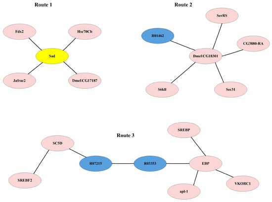 There are 236 IRs affecting ecdysone synthesis obtained in Section 3.2.2. In order to determine the reactions having a significant impact on the ecdysone synthesis, the flux of each IR was fixed at its maximum and minimum values, respectively, and the maximum synthesis rates of ecdysone were simulated and compared to determine the impact of each individual IR on ecdysone synthesis, as described in Method Section 2.5. As a result, most IRs have a quite small influence on the ecdysone synthesis. There are 16 IRs that have a significant impact on the synthesis rate of ecdysone with changes of over 3% (Supplementary File S5). These IRs constitute three synthesis routes including three metabolic reactions from the GSMN and sixteen proteins from the PIN (Figure 6).
