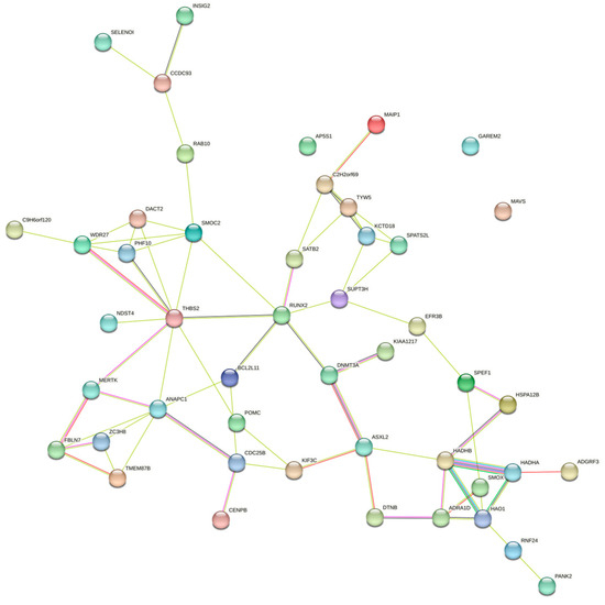 Enrichment analyses for GO terms and KEGG pathways were conducted on all candidate genes to pinpoint their roles in established metabolic pathways. Based on functional annotation results, significant pathways were identified for blood BHB (Figure 2; Supplementary Table S2). These comprised various KEGG pathways, including fatty acid elongation, β-alanine metabolism, fatty acid degradation, Valine, leucine, and isoleucine degradation, and fatty acid metabolism. Furthermore, they comprised GO terms such as chromatin binding, osteoblast development, histone acetyltransferase activity, T cell homeostasis, and positive regulation of the mitotic cell cycle. The relationships among the genes in the network were established using various methods, such as co-expression, gene fusion, protein homology, gene neighborhood, and gene co-occurrence. A network comprising 44 nodes connected by 65 edges was constructed (Figure 3).