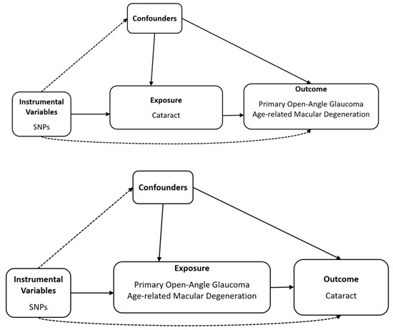 Mendelian randomisation (MR) is a genetic epidemiological approach, which employs genetic variants associated with risk factors as instrumental variables (IVs) to evaluate their causal impact on medical conditions [20,21]. Recently, several studies using MR techniques have shown the potential causal effects of several risk factors on ophthalmic diseases, such as POAG, AMD, cataract, uveitis, and myopia [22,23,24,25,26]. It is meaningful to investigate the association of cataract with glaucoma and AMD, as these are eye diseases, which share risk factors with geriatric diseases. To date, few studies have been conducted regarding the influence of cataract on AMD and glaucoma, as well as that of AMD or glaucoma on cataract using MR technology. A recent study assessed myopia by employing MR and revealed that glaucoma was significantly associated with an increased risk of cataract development [27]. More robust findings can be achieved if multiple datasets are used. Hence, it is anticipated that a large number of samples will increase the combination of BioBank Japan (BBJ) and UK Biobank (UKB) data, Genetic Epidemiology Research in Adult Health and Aging (GERA), and the International AMD Genomics Consortium (IAMDGC), leading to reliable results.