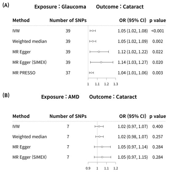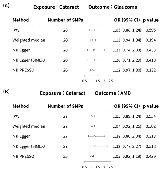 Cataract is defined as opacity of the lens due to loss of optical clarity concomitant with aging [51]. Cataract is well known in terms of causes, aging, medications, and exposure to UV rays; however, other metabolic factors, such as diabetes or obesity, may also be risk factors. An Asian study reported the association of an obesity-related gene (FTO) with cataract [52]. As cataract is affected by significant environmental components, the significance of SNP discovery is limited, e.g., when it is used as an IV for MR rather than to explain genetic predisposition. In this study, the SNPs with high OR values for cataract exposure on glaucoma were ZNF800 (rs62621812 with OR = 1.213), LOC338694;MYEOV (rs79721202 with OR = 1.144), BMP3 (rs72868578 with OR = 1.131), SOX2-OT (rs9823623 with OR = 1.093), and BET1L (rs11245997 with OR = 1.085) (Table S1). On the other hand, the SNPs with high OR values for cataract exposure on AMD were ZNF800 (rs62621812 with OR = 1.213), LOC338694;MYEOV (rs79721202 with OR = 1.144), BMP3 (rs72868578 with OR = 1.131), SLC24A3 (rs4814857 with OR = 1.112), and IGFBP3;LOC730338 (rs17172647 with OR = 1.067).