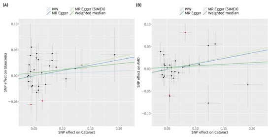 Scatter plots of MR tests assessing the effect of glaucoma or AMD on cataract. Scatter plots of MR tests assessing the effect of (A) glaucoma on cataract or (B) AMD on cataract. Light blue, dark blue, dark green, and light green regression lines represent the IVW, MR-Egger, weighted median, and MR-Egger (SIMEX) estimate, respectively. Red dots indicate outliers based on the MR-PRESSO. When outliers were present, MR-PRESSO results were generated, and other MR methods were analysed without outlier removal. SNP, single-nucleotide polymorphism; IVW, inverse variance weight; MR, Mendelian randomisation; SIMEX, simulation extrapolation; AMD, age-related macular degeneration.