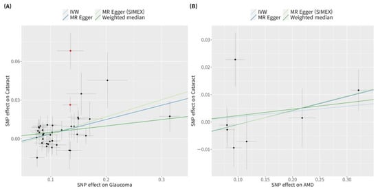 According to previous research [42], MR-PRESSO was the most reliable analysis technique (p = 0.132). For AMD, MR analyses using the IVW method did not reveal a significant causal relationship between cataract and AMD (p = 0.534; Figure 2B). Furthermore, no significant causal relationship between cataract and AMD was observed using the weighted median MR, MR-Egger, MR-Egger (SIMEX), and MR-PRESSO techniques (p = 0.382, p = 0.313, p = 0.318, p = 0.439, respectively; Figure 2B). Previous research has reported that among these methods [42], MR-Egger (SIMEX) is the most dependable method of analysis (p = 0.318). The genetic connection between cataract and glaucoma and AMD for each SNP is represented by scatter plots (Figure 3).