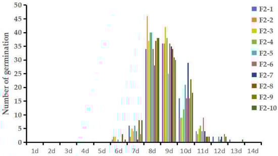 The germination rates of the parents (P1-73 and P2-22), F1, and F2 at 1–14 d are shown in Table 1. The dormancy phenotype of the eggplant seeds was represented by the germination rate on the eighth day. The seed dormancy of the eggplant parents was quite different; the male parents began to germinate on the fourth day, and the germination rates of the male seeds were 94.3% on the eighth day and 100% on the eleventh day. However, the female seeds began to germinate on the seventh day, and the germination rate was only 14% on the eighth day and 76.3% on the fourteenth day. These statistics indicated that the male seed dormancy was weak, while the female seed dormancy was strong. The F1 populations began to germinate on the sixth day, and the germination rates were 14.3% on the eighth day and 84.3% on the fourteenth day, so the F1 seeds also had strong dormancy characteristics. Among the 10 replicates of the 1000 F2 seeds collected, the average germination rates were 42.9% on the eighth day and 99.6% on the fourteenth day. As shown by the statistical data on the daily germination of the F2 seeds, their dormancy was normally distributed, indicating that the dormancy of eggplant seeds is a quantitative trait that is controlled by multiple genes (Figure 1; Table S1).