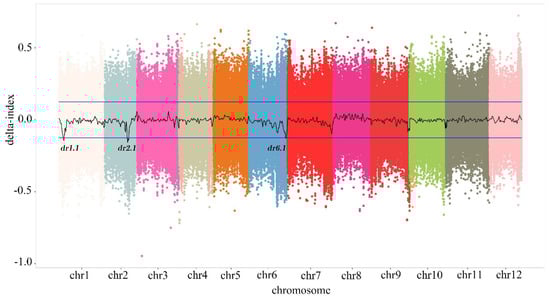 The △ (SNP index) distribution of the QTLs for the seed dormancy index detected with QTL-Seq. Chromosome distribution of the SNP/indel indexes in two progenies.