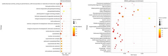 The obtained QTL sites related to eggplant seed dormancy were screened for the prediction of seed dormancy controlling genes. Queries for homologous gene sequences from the NCBI (https://www.ncbi.nlm.nih.gov/, accessed on 16 May 2023) and the eggplant genome website (http://eggplant-hq.cn/Eggplant/home/index, accessed on 3 June 2023) were used to compare related genes and annotate the gene functions. Firstly, in the three candidate intervals, the genes with the functions related to seed dormancy were selected according to gene annotation. Secondly, based on previous studies, the sequences of the genes related to seed dormancy in rice, wheat, and tomato were downloaded and blasted against the eggplant genome to detect homologous genes in eggplant. The genes with an identity of over 85% and a coverage over 90% in the QTL regions were also regarded as candidate genes for eggplant seed dormancy. After combining these results with those of the non-synonymous mutation sites, a total of 9 candidate genes were finally selected.