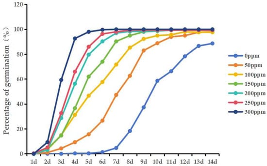 In the control treatment, the seeds germinated from the fourth day, and the germination rate gradually increased from 6 to 12 d, reaching 88.67% on the fourteenth day. When the concentration of GA3 was 50 mg·L−1, the germination rate was less than 30% from 0 to 6 d, and it significantly increased from 7 to 10 d. The germination rate reached 95% or more on the twelfth day. The germination rate of seeds treated with GA3 at a concentration of 100 mg·L−1 was only about 15% from 0 to 3 d, and it reached 85% or more from 4 to 8 d. The germination rate reached 95% or more on the tenth day. The germination rates of seeds treated with GA3 at concentrations of 150, 200, and 250 mg·L−1 were higher from the second day. The germination rate of the seeds treated with 150 mg·L−1 GA3 reached 90% or more on the seventh day, and the germination rate was above 98% on the tenth day. The germination rate of seeds treated with a concentration of 200 mg·L−1 was more than 90% on the sixth day, and the germination rate was more than 98% on the eighth day. The germination rate of seeds treated with GA3 at a concentration of 250 mg·L−1 was more than 95% on the sixth day, and the germination rate was more than 98% on the seventh day. The seeds treated with GA3 at a concentration of 300 mg·L−1 showed the fastest germination speed, with the germination rate reaching 90% on the fourth day and 100% on the seventh day (Figure 5; Table S5). In conclusion, within a certain range, the GA3 concentration was positively correlated with the germination rate, and the time of emergence could also be advanced. In this experiment, the concentration of GA3 was 200–250 mg·L−1, and the germination rate of the seeds at 6 d was already more than 90%. Therefore, choosing to soak seeds with a shallow dormancy in GA3 at a concentration of 200–250 mg·L−1 for 12 h before seeding is sufficient to relieve dormancy; too high a concentration of GA3 may have effects on the seeds.