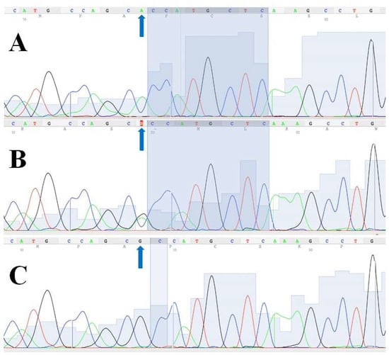 Fluorogram of the rs1761667 polymorphism from CD36 gene sequencing: (A) homozygous for the A allele (AA); (B) heterozygous (AG); (C) homozygous for the G allele (GG). The arrows indicate the position of the CD36 rs1761667 polymorphism in three individuals with different genotypes.
