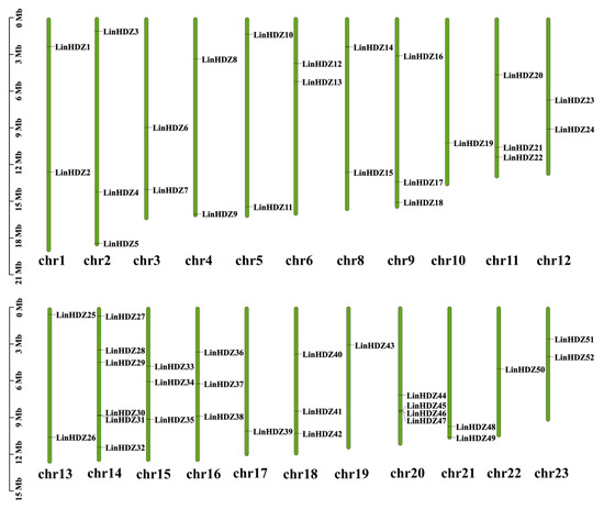 The chromosome distribution of the selected LinHDZ genes was predicted with Gene Location Visualize from GTF/GFF function of TBtools software.