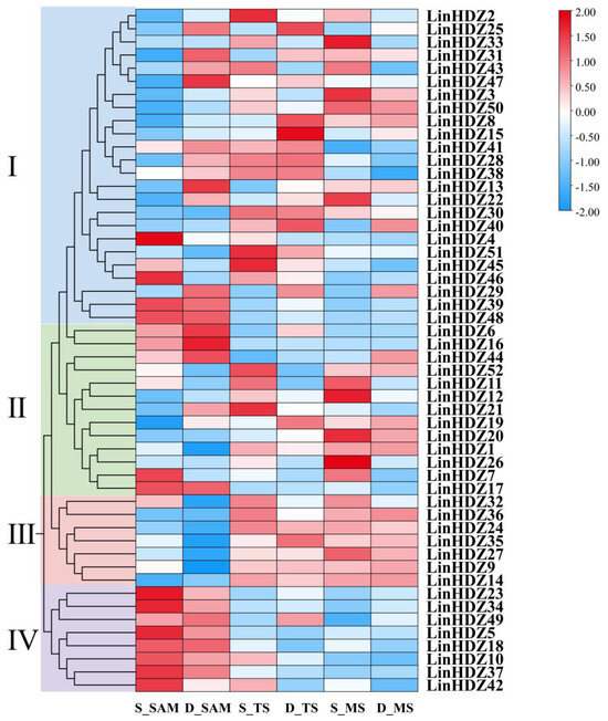 Cluster analysis of LinHDZ expression profiles in Lagerstroemia indica. The heat map was generated based on the log2-transformed relative expression values of LinHDZs in the shoot apical meristem (S_SAM), tender stem (S_TS), and mature stem (S_MS) of non-dwarf crape myrtle, and the shoot apical meristem (D_SAM), tender stem (D_TS), and mature stem (D_MS) of dwarf crape myrtle. Expression levels are depicted using a color gradient ranging from blue (downregulated) to red (upregulated).