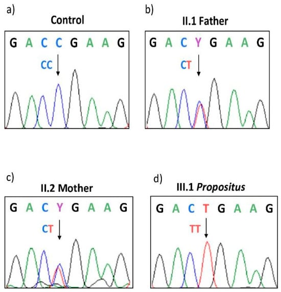 Sanger sequencing in F5 exon 13 showing the c.3481C>T stop-codon. (a–d) normal control, heterozygous pattern in the father (II1) and in the mother (II2), and homozygous status in the propositus (III1) respectively. In the nucleotide sequence, Y indicates that both C and T have been detected.