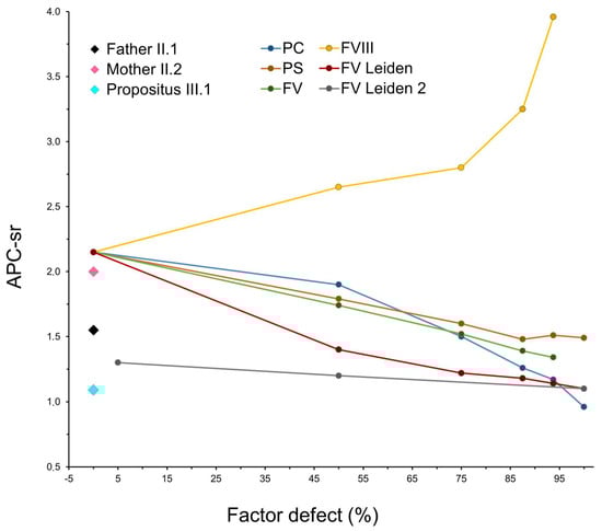 Figure 3 shows the anticoagulant profiles of PC, PS, and FV assessed as the ratio of sensitivity to APC (APC-sr) of the different scalar dilutions and compares them to FV-Leiden (a reference APC-resistant molecule) and FVIII (a classical factor showing only procoagulant ability). In detail, it is strongly evident that, as the percentage of FV-Leiden increased in the system, the APC-sr score decreased, and so they are inversely related (red line in Figure 3). On the contrary, APC-sr and FVIII levels (assessed as a percentage of the defect) are directly related, which means that as the levels of FVIII decreased, the response and sensitivity to APC increased (yellow line in Figure 3). Interestingly, when the FV-Leiden sample was diluted with FV-depleted plasma (grey line in Figure 3), it showed a more resistant phenotype in terms of APC-sr compared to the dilutions performed in the normal pool plasma (red line). This is in accordance with the reported pseudo-homozygous condition of FV-Leiden, which was established when p.R506Q and an FV type I deficiency have trans-coinheritance [,].