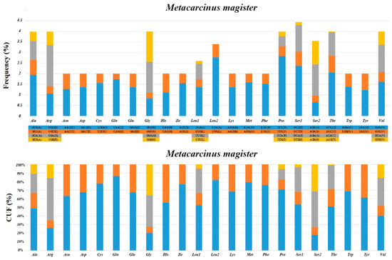 The relative synonymous codon usage (RSCU) analyses and relative usage frequency (CUF) of the 13 PCGs in M. magister are summarized in Figure 2. As in other Brachyura mitogenomes, we found a crucial correlation between codon usage and nucleotide composition. Resembling previous studies in other Brachyuran mitogenomes, the amino acids Ser, Leu, and Pro were the most frequently used, and Leu (UUA) had the largest relative synonymous codon usage. The total number of codons was 3710 in the PCGs of M. magister, in addition to the termination codons. The codon families occurred with the same codon usage patterns as in other Brachyuran species, and there was a significant predominance of the usage of one codon containing all of the possibilities in all cases. In M. magister, the abundance of the most frequently used codon was equivalent to or less than 50% in the following: Ala, Gly, Ser, and Val. Furthermore, the amino acids that used the most codons in M. magister were Ala, Arg, Gly, Leu, Pro, Ser, Thr, and Val. These codons were mostly comprised of A or T nucleotides, which indicated the biased usage of A and T nucleotides in the PCGs of M. magister. The overall A + T content of the 13 PCGs was 65.8%, and the AT-skew was negative, which implied a higher occurrence of Ts than As.