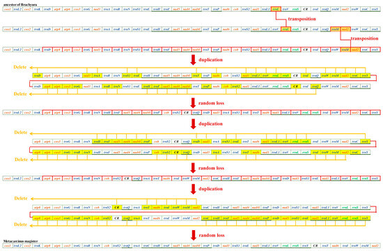 Through mechanism analysis, the MGO of Cancroideans required two transposition events and two duplication–random loss (tdrl) events. We found that transpositions occurred first, and this caused the positions of rrnl and trnM-nad2 to change. rrnl shifted into trnV and rrnS instead of the usual location between trnL1 and trnV; trnM-nad2 was located between trnQ and trnW, but here, it was found in trnW and trnC. These three genes are highlighted in orange (Figure 4). It is widely believed that the two complicated tdrl genes could explain the movement of a large number of mitochondrial genes. All of the mitogenomes involved in the duplication were labeled individually, and all of the random loss genes are highlighted in yellow (Figure 4).