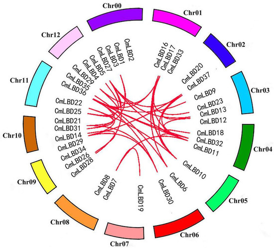 The synteny analysis diagram (Figure 1) and chromosomal location diagram (Figure 2) of the melon LBD gene family were plotted respectively. The LBD genes are unevenly distributed across 13 chromosomes, with chromosome 10 and 11 having the highest number of genes (five), and chromosomes 5, 7 having the least (one each). Only two genes are distributed on chromosomes 0, 2, 6, and 8. Homologous genes on a chromosome can be considered tandem repeat genes if their physical positions do not exceed 100 kb [15]. A tandem duplication event (CmLBD1/2) was identified in the melon genome. Additionally, there are 38 segmental duplication gene pairs present within the duplicated segments of the melon genome. These findings suggest that some CmLBDs may have originated from gene duplication, with segmental duplication events being a major driving force in the evolution of CmLBDs. Gene duplication events are common in all species, as they can generate new functional genes and drive species evolution [16,17].