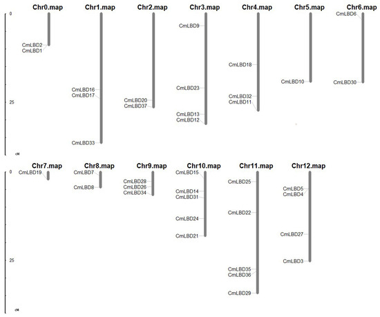 The CmLBD family genes were searched in the Cucurbit Genomics Database, yielding the chromosomal location information of 37 genes. The information for each chromosome was converted into corresponding files, and the chromosomal location map was created using the MapInspect 1.0.