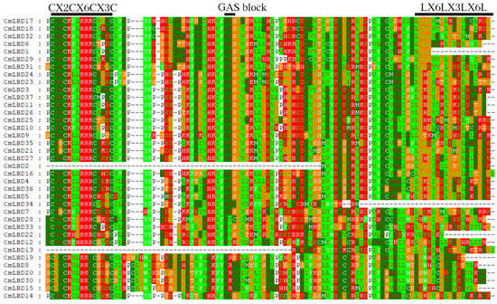 We performed an alignment of the protein sequences of the 37 members of the melon LBD gene family (Figure 4). The LOB domain is mainly composed of three conserved sequences: the zinc finger-like structure (CX2CX6CX3C), the GAS region, and the leucine-zipper-like model (LX6LX3LX6L). Among these, CmLBD2 and CmLBD13 completely lack both the zinc finger-like structure and the GAS region. CmLBD34 completely lacks the leucine-zipper-like model, while CmLBD1, CmLBD19, and CmLBD22 have partially truncated leucine-zipper-like models. The leucine-zipper-like model has relatively more mutations compared to the other two conserved sequences.