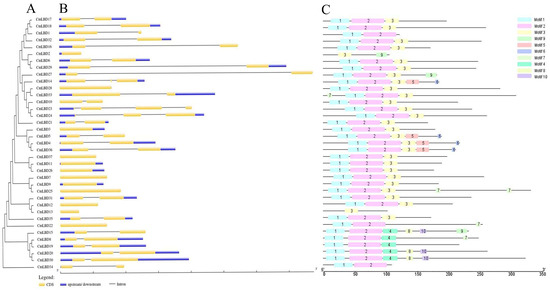 Gene structure and phylogeny of the melon LBD family. (A) The neighbor-joining (NJ) phylogenetic tree for the CmLBD protein family. (B) Exon–intron structure of CmLBD genes. (C) Distribution of 10 motifs in 37 CmLBD proteins.