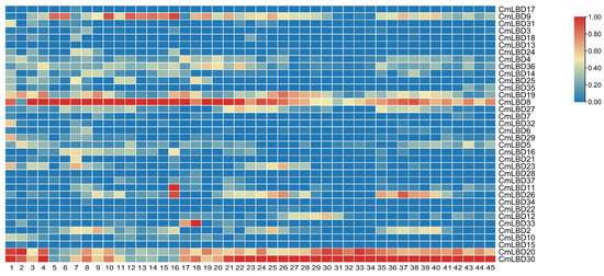 To further explore the function of LBD genes, we retrieved the expression specifics of melon LBD family genes in different tissues and at different time points through the Melonet DB website (Figure 6). The results showed that, among the 37 genes retrieved, only CmLBD13 was not expressed. The remaining genes showed significant differences in expression levels in different organs and at different times, demonstrating tissue specificity.