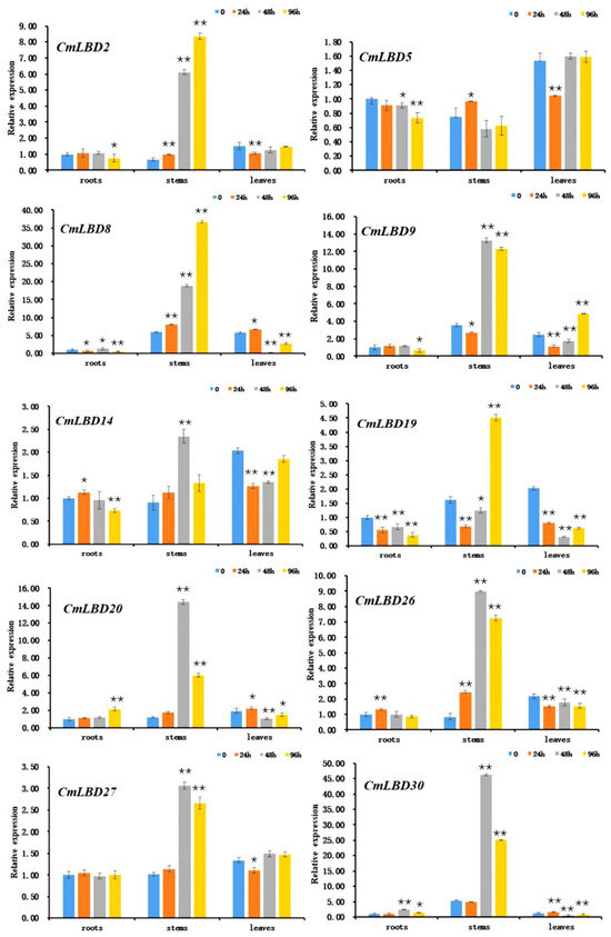 Expression of melon LBD family genes in response to wilt bacteria. The asterisk indicates the p value in the significance test (** p < 0.01 and * p < 0.05).