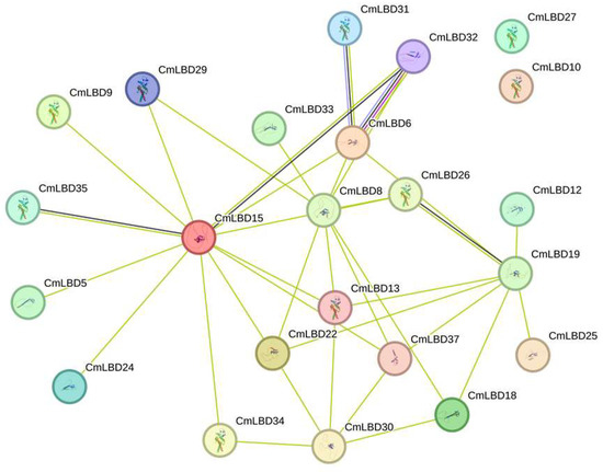 Potential interactions among CmLBD proteins were predicted using the STRING database (Figure 9). The CmLBD protein interaction network consists of 21 nodes, each communicating with other nodes. It was observed that CmLBD15 acts as a central hub in the network with numerous connections, suggesting its potential core role in regulating the network. In contrast, nodes like CmLBD5, despite having fewer connections, may still participate in specific interactions. Complex multigene interaction relationships, such as the connections between CmLBD6, CmLBD8, and CmLBD26, might indicate a synergistic function of these proteins within the network. This network diagram can assist in predicting the complexity of gene regulation and their potential roles in biological processes.