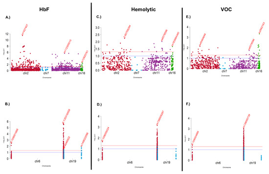 We additionally performed a VOC versus Hemolytic logistic association test, and no variant reached the genome-wide level of significance; however, several variants reached a nominal level of significance (<0.05) at 18 chromosomal regions (Figure 4C, Supplementary Table S4(1)), including chromosome 2 (p11.1, p24.1, q14.3, and q24.2), chromosome 6 (p22.3, p24.2, q11.1, q16.1, and q21), chromosome 7 (p15.3, q11.21, and q21.11), chromosome 11 (p11.12, q11, and q13.2), and chromosome 16 (p11.2, p12.3, and q11.2). These identified variants within the chromosomal regions are nominally associated with increasing VOC (OR > 1, Supplementary Table S4(1)) and are potential genetic modifiers inducing phenotypic variation among patients with VOC and Hemolytic phenotypes in Angola SCA. Conversely, we conducted a lower versus higher HbF logistic association test, and no variants, at genome-wide level of significance, were detected. However, variants in Figure 4D and Supplementary Table S4(2) ranging in 12 chromosomal regions were nominally associated with lower HbF (increasing the lowness of HbF, OR > 1, Supplementary Table S4(2)), including chromosome 2 (2p11.1, 2q24.2, 2p16.1, and q32.2), chromosome 16 (p11.2, q11.2, and q23.2), chromosome 6 (p22.1 and q16.3), chromosome 11 (q11 and q24.3), and chromosome 7q11.21. Most of the genes associated with these nominally significant variants, including BCL11A (Supplementary Table S4(2)), are, interestingly, part of the BCL11A functional/physical and co-expression network.