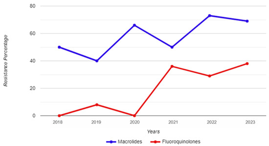 The total percentage of macrolide resistance in the tested strains was 60.4%, while this percentage was 19.2% for fluoroquinolone resistance. Among all the unique (i.e., not re-tested) strains, the co-occurrence of macrolide and fluoroquinolone resistance was 18.2%. A total of 43.4% of the tested strains were resistant to macrolides only; conversely, there was only one strain resistant to fluoroquinolones that did not show a concurrent resistance to macrolides.