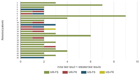 A total of 26 patients were re-tested. These samples were not included in our prevalence assessment, but they provide important insights into epidemiological trends regarding resistance detection by molecular methods. More specifically, 13 patients were re-tested once, 8 patients twice, 3 of them three times, and finally, 1 patient each underwent re-testing five, six, and eight times, respectively.