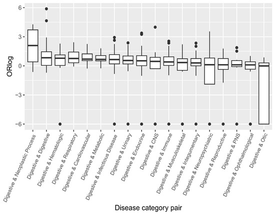 Odds ratio distribution between digestive category and other categories. Each dot represents ORlog value between any one disease from digestive category and any one disease from other disease category. The distribution is in a descending order of the median of ORlog between each disease of digestive category and each disease of other categories. ORlog was set to ‘−6’ if ORlog eq ‘−Inf’. Each category’s diseases are listed in Supplementary Table S6.
