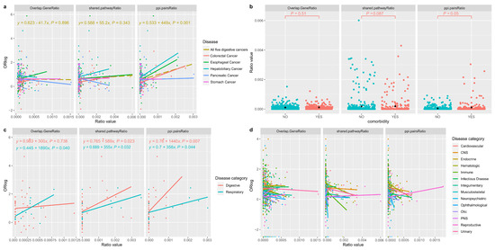 It is important to note that two categories (Metabolic and Neoplastic Process), each containing fewer than 3 diseases, were excluded from this analysis, as they did not provide sufficient data to calculate R2 values. Figure 3a illustrates the correlations between logarithm of odds ratio (ORlog) and the ratio of overlapped susceptibility genes, shared pathways ratio and PPIs between five digestive cancers and other diseases. The positive relationships were not statistically significant at the levels of both gene number ratio (p = 0.896) and shared pathways ratio (p = 0.343), but they became significant at the level of PPIs ratio (p = 0.001). Figure 3b demonstrates that the differences between non-comorbidity disease pairs and comorbidity disease pairs were not statistically significant at the levels of both gene number ratio (p = 0.51) and shared pathways ratio (p = 0.087), but they became significant at the level of PPIs ratio (p = 0.05). Both Figure 3a,b indicate that the number of overlapped genes and shared pathways alone may not predict the likelihood of co-occurrence. Instead, the more extensive the interactions (PPIs) between disease pairs, the greater the likelihood of these disease pairs co-occurring. In other words, disease pairs with higher correlations (odds ratios) tended to be exhibit stronger connections within the PPI network. This suggests that PPIs could potentially mediate comorbid relationships between diseases. This finding aligns with the observations made in Carlota et al.’s work [28], where it was revealed that functional overlap contributed to nearly 95% of the associations in the disease network.