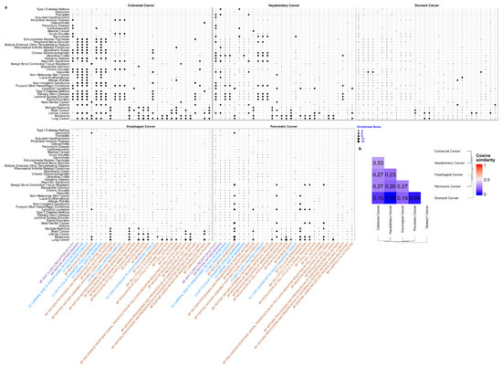 As illustrated in Table S5, there were a total of 514 gene sets in which pleiotropic genes shared between digestive cancers and other diseases were significantly enriched. There were 55 diseases in total that had significantly enriched gene sets shared with digestive cancers. Figure 4a shows all 55 diseases on the y-axis and the top 30 enriched gene sets on the x-axis. Among the five digestive cancers, Colorectal Cancer and Hepatobiliary Cancer shared the largest number of functional gene sets, with a cosine similarity of 33% (see Figure 4b). Conversely, Hepatobiliary Cancer and Stomach Cancer shared the smallest number of functional gene sets, with a cosine similarity of 3% (see Figure 4b), in concordance with the shared gene situations previously mentioned.