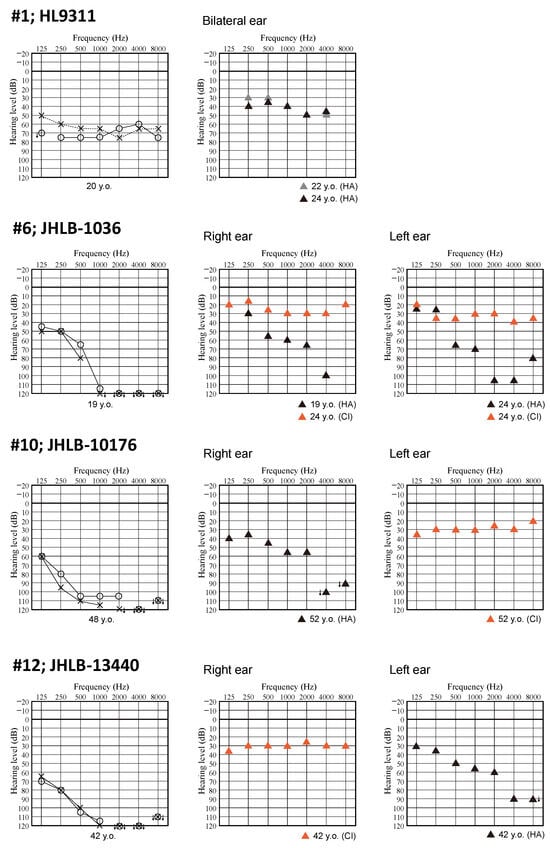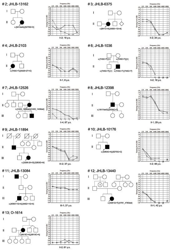 Clinical information and peripheral blood or saliva samples were obtained from each proband and from all consenting relatives. Clinical information including (1) onset age; (2) hearing level and severity; (3) progression of HL; (4) pedigree; (5) intervention for HL and sound field threshold levels, with hearing aid or cochlear implant, were collected from medical charts. During the recruitment process, all participants were asked about any episodes or symptoms of vertigo. Evaluation of HL was performed by pure-tone audiometry. The average hearing level was calculated from the audiometric thresholds at four frequencies (500, 1000, 2000, and 4000 Hz). The severity of HL was classified based on the better hearing ear as normal (<20 dB), mild HL (21–40 dB), moderate HL (41–70 dB), severe HL (71–95 dB), and profound HL (>95 dB) []. The audiometric configurations were categorized into flat, low-frequency ascending, mid-frequency U-shaped, high-frequency gently sloping, and high-frequency steeply sloping, as reported previously []