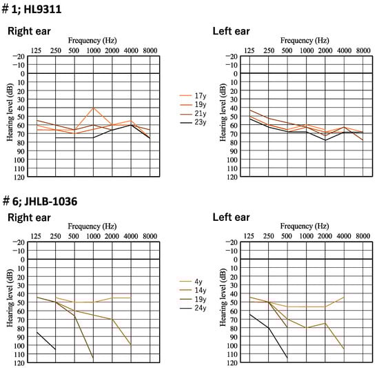 Serial audiograms of two patients with PTPRQ variants (family numbers 1 and 6).