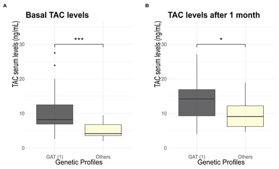 (A) Comparison between TAC levels and genetic profile in baseline; p = 0.009. (B) Comparison between TAC levels and genetic profile after one month of kidney transplantation measurements; p = 0.04. * means p < 0.05; *** means p < 0.001.