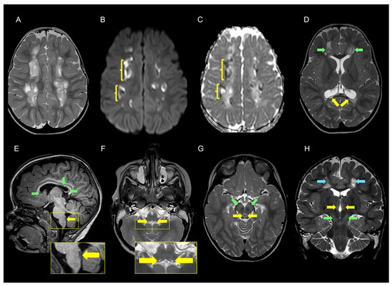Cerebral MRI examination of the patient at the age of 2 years and 9 months. (A) T2 weighted axial image at the level of the centrum semiovale shows multiple lesions with varying degrees of high signal intensity typical of cavitary leukoencephalopathy. (B,C) Axial diffusion-weighted magnetic resonance imaging (DWI) (b1000 (B) and apparent diffusion coefficient (ADC) maps) (C) at the level of the centrum semiovale shows diffusion restriction along the margins (yellow parenthesis) of the cavitary leukoencephalopathy. (D) T2 weighted axial image at the level of corona radiata shows high signal of cavitary leukoencephalopathy in both frontal lobes (green arrows) and corpus callosum cysts (yellow arrows). (E) T1 weighted sagittal image shows thinning of the corpus callosum with low intensity foci compatible with cystic formations (green arrows). In the dorsal aspect of medulla oblongata, there is a 7 mm elongated low-signal lesion (yellow arrows). A magnification of this area is displayed in the rectangle below. (F) T2 weighted axial image at the level of the upper part of the medulla oblongata shows symmetric minute high signal changes (yellow arrows). An enlarged image of the area is shown in the rectangle below. The lesions correspond to the dorsal lesion displayed in the rectangle in E and are localized in close proximity to the dorsal motor nuclei of the vagus nerve. (G) T2 weighted axial image at the level of the mesencephalon shows high signal of periaqueductal gray matter (yellow arrows) and subtle increased signal in the substantia nigra on both sides (green arrows). (H) T2 weighted coronal image shows subtle high signal in the medial parts of both thalami (yellow arrows) and substantia nigra (green arrows) on both sides. There are also signal changes in the cerebral white matter at the level of centrum semiovale on both sides (blue arrows).