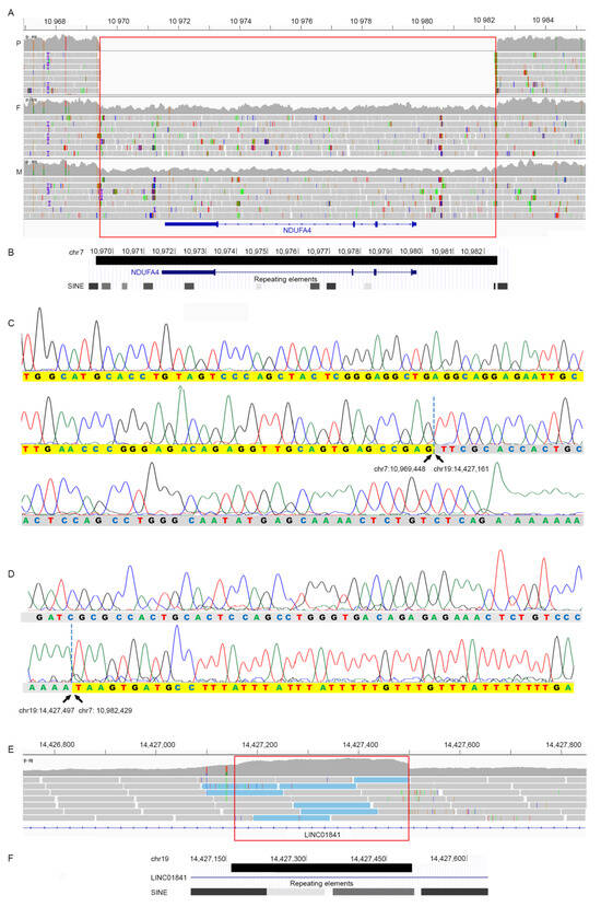 (A) WGS data of the patient (P), her father (F), and mother (M) showing the homozygous 12.9 Kb deletion (red box) on chromosome 7 overlapping the entire NDUFA4 gene seq[GRCh37]del(7)(p21.3) NC_000007.13:g.10969473_10982428. The parents were heterozygous for the deletion (note the decreased read depth). Genomic positions are in Kb. (B) Modified screenshot from UCSC genome browser showing the deletion (black bar) chr7:10,969,448–10,982,429 and the presence of Alu elements at its borders. Genomic positions are in Kb. (C) Sanger sequencing of the PCR product amplifying the proximal breakpoint of the chr7 deletion. Bases highlighted in yellow identify sequence from chr7, bases in grey identify sequences from chr19, which start at chr19:14427161. (D) Sanger sequencing of the PCR product amplified at the distal breakpoint of the chr7 deletion, juxtaposed to chr19:14,427,497. In (C,D), bases highlighted in yellow and grey identify sequences from chr7 and chr19, respectively. (E) WGS data from the patient showing increased read depth in the region from chr19:14,427,161–14,427,497 indicating a duplication (red box). This sequence was found inserted at chr7:10,969,448. Note that the reads with a paired end mapping at chr7 are indicated in light blue. (F) Modified screenshot from UCSC genome browser showing the duplicated region (black bar) at chr19:14,427,161–14,427,497 and its overlaps with Alu elements.