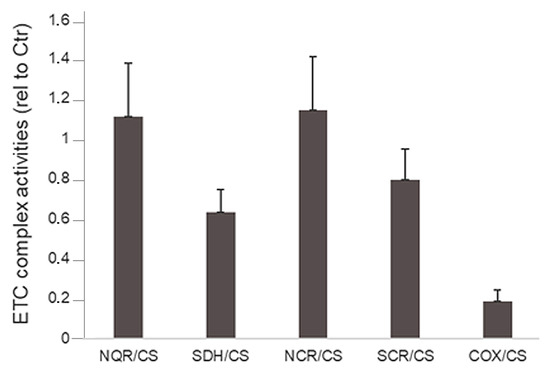 The ETC complex activities in fibroblasts from the patient presented relative to those in control fibroblasts. The activities were measured in whole cell lysates as described in the Materials and Method. Cells from 3 independent cultivations were used. COX/CS activity is significantly lower than control values (p = 0.005). For NQR/CS and SDH/CS: n = 2.