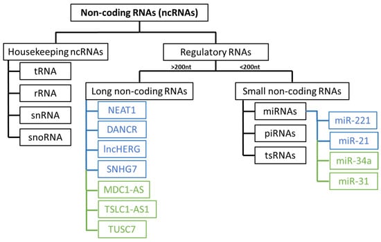 Non-coding RNAs (ncRNAs) classification and some lncRNAs and miRNAS with oncogenic (blue) and tumor suppressor (green) potential in glioblastoma. Housekeeping ncRNAs include transfer RNA (tRNA), ribosomal RNA (rRNA), small nuclear RNA (snRNA) and small nucleolar RNA (snoRNA). Regulatory RNAs include long non-coding RNAs and small non-coding RNAs. MicroRNAs (miRNAs), PIWI-interacting RNAs (piRNAs), and tRNA-derived small RNAs (tsRNAs) are small non-coding RNAs.