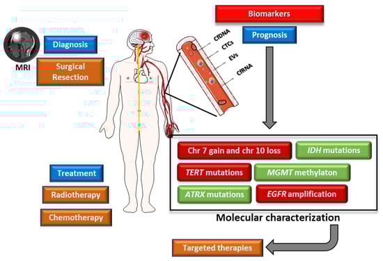 - Gatto, L.; Franceschi, E.; Di Nunno, V.; Tosoni, A.; Lodi, R.; Brandes, A.A. Liquid Biopsy in Glioblastoma Management: From Current Research to Future Perspectives. Oncologist 2021, 26, 865–878. [Google Scholar] [CrossRef] [PubMed]