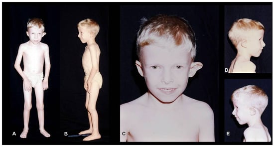 Photographs of the patient at the age of 4 years showing his overall body aspect (A,B) and facial features (C–E); note the dysmorphic left ear, hooded eyes, and pale skin and hair color.