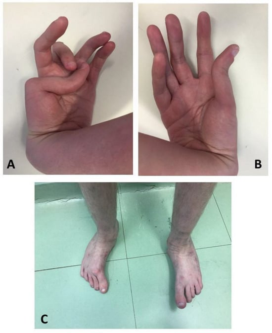 Articular deformities of the patient’s left hand (A), right hand (B), and feet (C) at the age of 23 years.