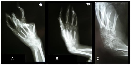 Radiographic changes in the left (A) and right hands (B), with a closer view of the carpal fusion in the right hand (C).