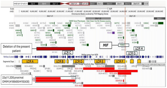 Schematic representation of the 22q11.2 locus; the purple bar shows the patient’s deletion in comparison to the proximal deletion region (the red bars below) and the distal deletion region (the remaining red bars). The location of the MIF gene is also emphasized. The orange boxes indicate the location of the low copy repeats (LCRs) A to H.