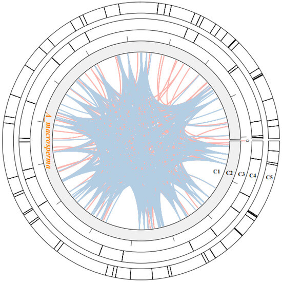 The analysis of sequence similarity indicated that the 17,783 bp sequences discovered in the A. macrosperma mitogenome likely originated from the corresponding cp-genome (Figure 3; Table S6), constituting 2.36% of the mitogenome’s sequence. A total of fifty-three homologous fragments were identified, with the longest measuring 4296 bp, between the mitogenome and cp-genome. Furthermore, these sequences’ homologous fragments encompassed eight chloroplast genes (rpoC1, ndhB, rps7, rps12, rrn16, psbF, psbE, petL) from A. macrosperma cp-genome and four mitochondrial genes (trnA-UGC, trnI-AGU, trnV-GAC, trnW-CCA) from A. macrosperma mitogenome.