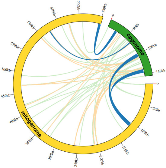 Chloroplast-mitochondrion-DNA transfer. The cp-genome of A. macrosperma (MN520000.1) was acquired through the NCBI Organelle Genome Resources Database (https://www.ncbi.nlm.nih.gov/genome/browse#!/organelles/, uploaded on 16 August 2020). Detection of transferred DNA fragments between chloroplast and mitochondrion genome was carried out using BLASTN, employing specified criteria: a matching rate of ≥80%, E-value of ≤1 × 10−10, and a minimum length of ≥40 [43]. Visualization of the results was conducted utilizing the software Tbtools [44] (version: 2.041, https://github.com/CJ-Chen/TBtools-II/releases clicked on 30 November 2023), leveraging its advanced circos module.