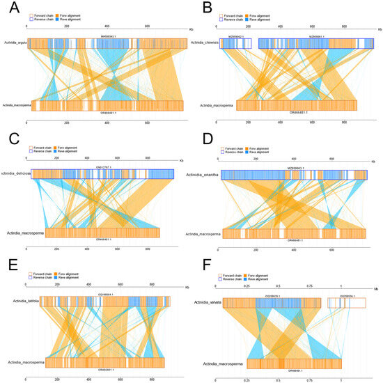 The diagrams delineate collinear regions observed among disparate mitogenomes in additional Actinidia species when compared to A. macrosperma ((A): Actinidia arguta; (B): Actinidia chinensis; (C): Actinidia deliciosas; (D): Actinidia eriantha; (E): Actinidia latifolia; (F): Actinidia valvata). The outer frame colors represent the orientation of the mitogenomes sequences (orange indicating the forward direction and blue indicating the reverse direction), while the fill colors represent the alignment status (orange indicating forward alignment and blue indicating reverse alignment).