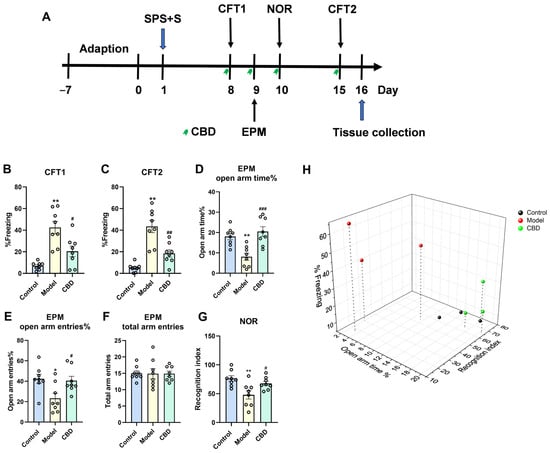 CBD showed anti-PTSD effects in the SPS+S PTSD model. (A) Experimental timeline and treatment schedule for the SPS+S-induced mouse model of PTSD. (B,C) On day 8 and day 15, CBD significantly reduced the contextual freezing behavior in the CFT. (D–F) On day 9, CBD reversed the decreased open arm time and open arm entries without influencing the total number of arm entries in the EPM test. (G) CBD reversed the decreased recognition index in the NOR test. (H) Three-dimensional behavioral scatterplots of three animals per group selected from the control, model, and CBD groups for single-nucleus RNA sequencing (snRNA-seq). The results are presented as the mean ± S.E.M. One-way analysis of variance (ANOVA) was conducted and was subsequently complemented by a Tukey post hoc test. * p < 0.05 and ** p < 0.01 compared with the control group; # p < 0.05, ## p < 0.01, and ### p < 0.001 compared with the model group; n = 8.