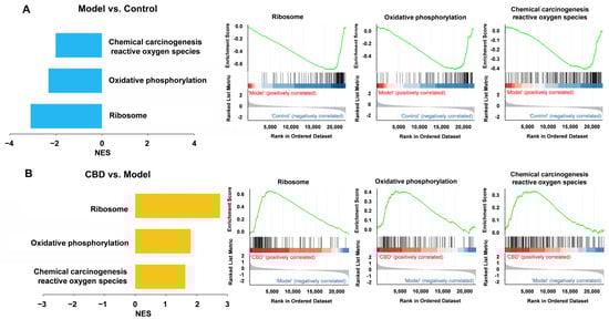 GSEA analysis of all genes in the ExNs from the control group, model group, and CBD group. (A) GSEA analysis of all genes of the model group vs. control group. The green line represents the running enrichment score (ES) as the analysis moves down the ranked list. The value at the peak is the final ES. Genes enriched in the model group are depicted as positive ES (red), and genes enriched in the control group are depicted as negative ES in blue. (B) GSEA analysis of all genes of the CBD group vs. model group. The green line represents the running ES as the analysis moves down the ranked list. The value at the peak is the final ES. Genes enriched in the CBD group are depicted as positive ES (red), and genes enriched in the model group are depicted as negative ES in blue. NES = normalized enrichment score.
