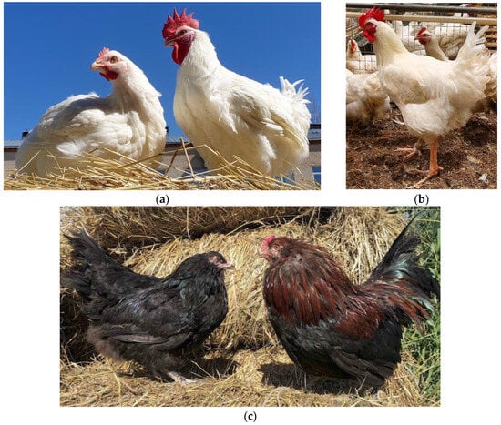 The three chicken breeds examined in this study. (a) Cornish White (female, left; male, right); (b) Plymouth Rock White (male, front; females, back); and (c) Ushanka (female, left; male, right).