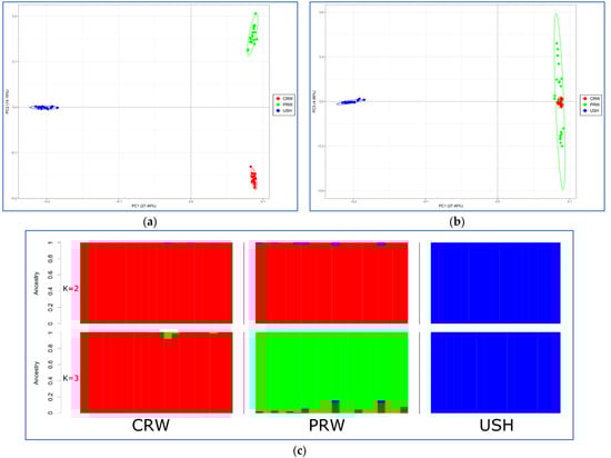 PCA revealed that the three studied breeds formed the appropriate breed-specific clusters (Figure 2a,b). Moreover, the USH chickens, being separated from the two meat-type breeds, demonstrated the lowest genetic variability based on their scattering on both PCA plots. The individuals that made up the PRW sample were more diverse than CRW and USH. The admixture analysis resulted in the optimal number of ancestral populations at K = 3 (Supplementary Figure S1), suggesting also that a few CRW and PRW individuals reflected admixtures from the other breeds in this dataset, while such admixtures were absent in USH (Figure 2c).